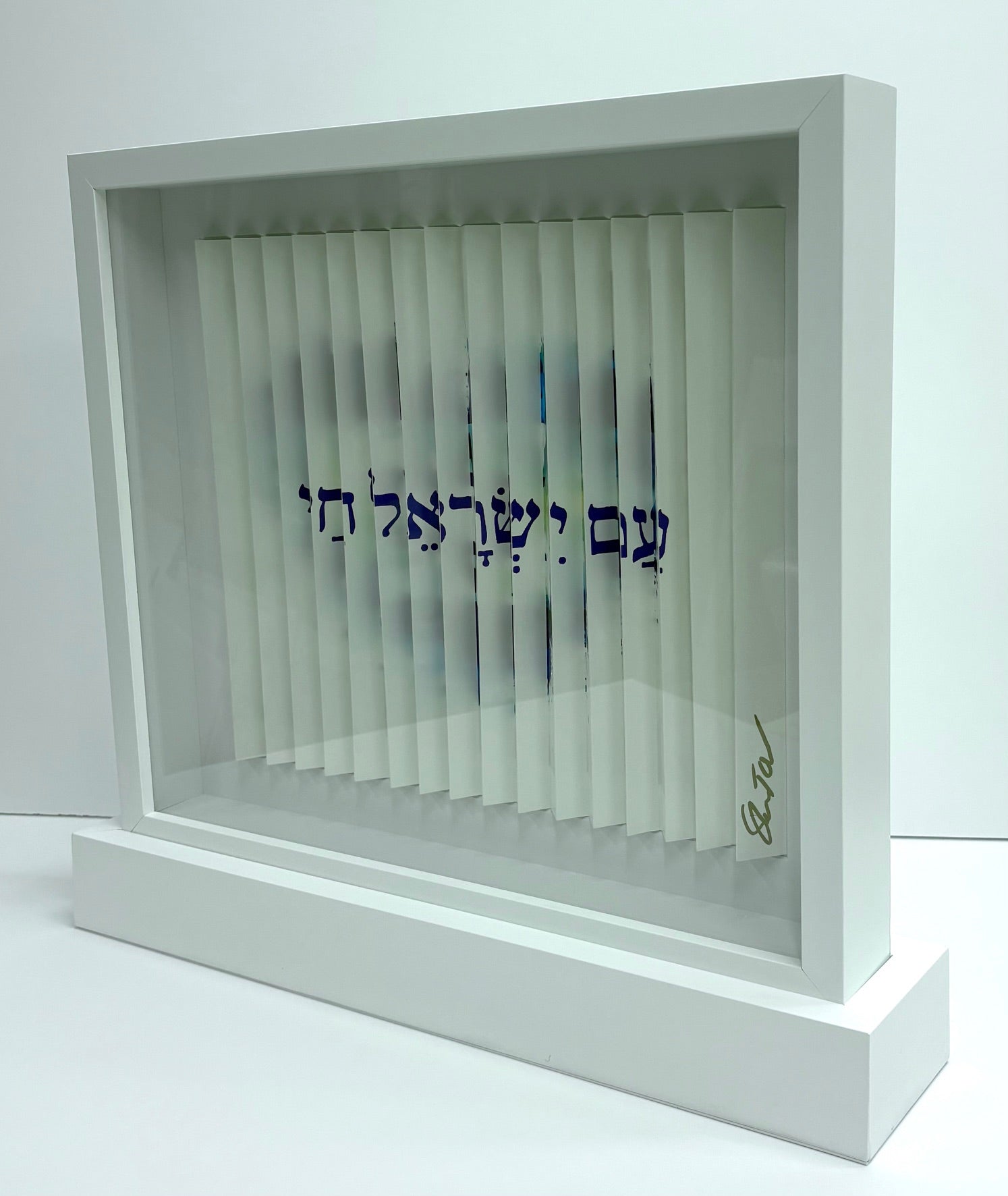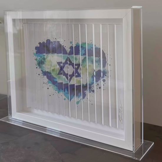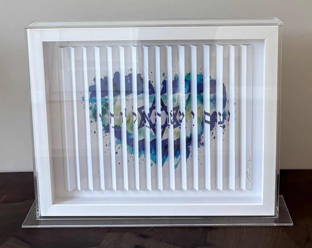 This captivating artwork, titled "Am Yisrael Chai," features a striking depiction of the Israeli flag, elegantly shaped in deep shades of blue. The design evokes a profound sense of love and patriotism for the land of Israel.