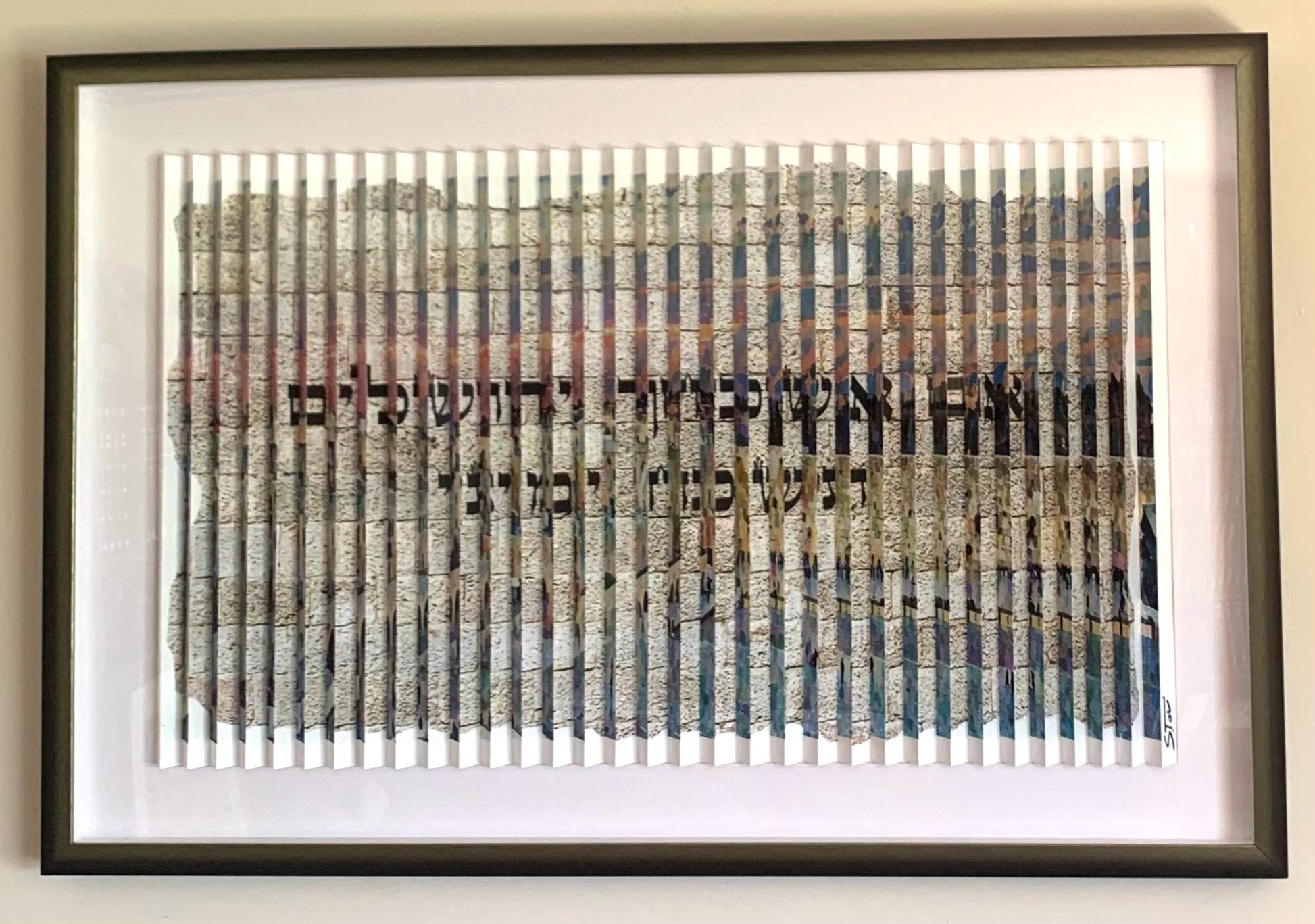 This artwork is titled "Jerusalem." When viewing the image, one can see the glorious city of Jerusalem and, more importantly, the holiest place in the world—the Temple Mount. However, when the viewer looks from a different angle, the image transforms into the words of Psalm 137:5, "If I forget Jerusalem, may my right hand forget its skill," conveying the message that we should never forget the once-great glory of Jerusalem and that it will return to us again.