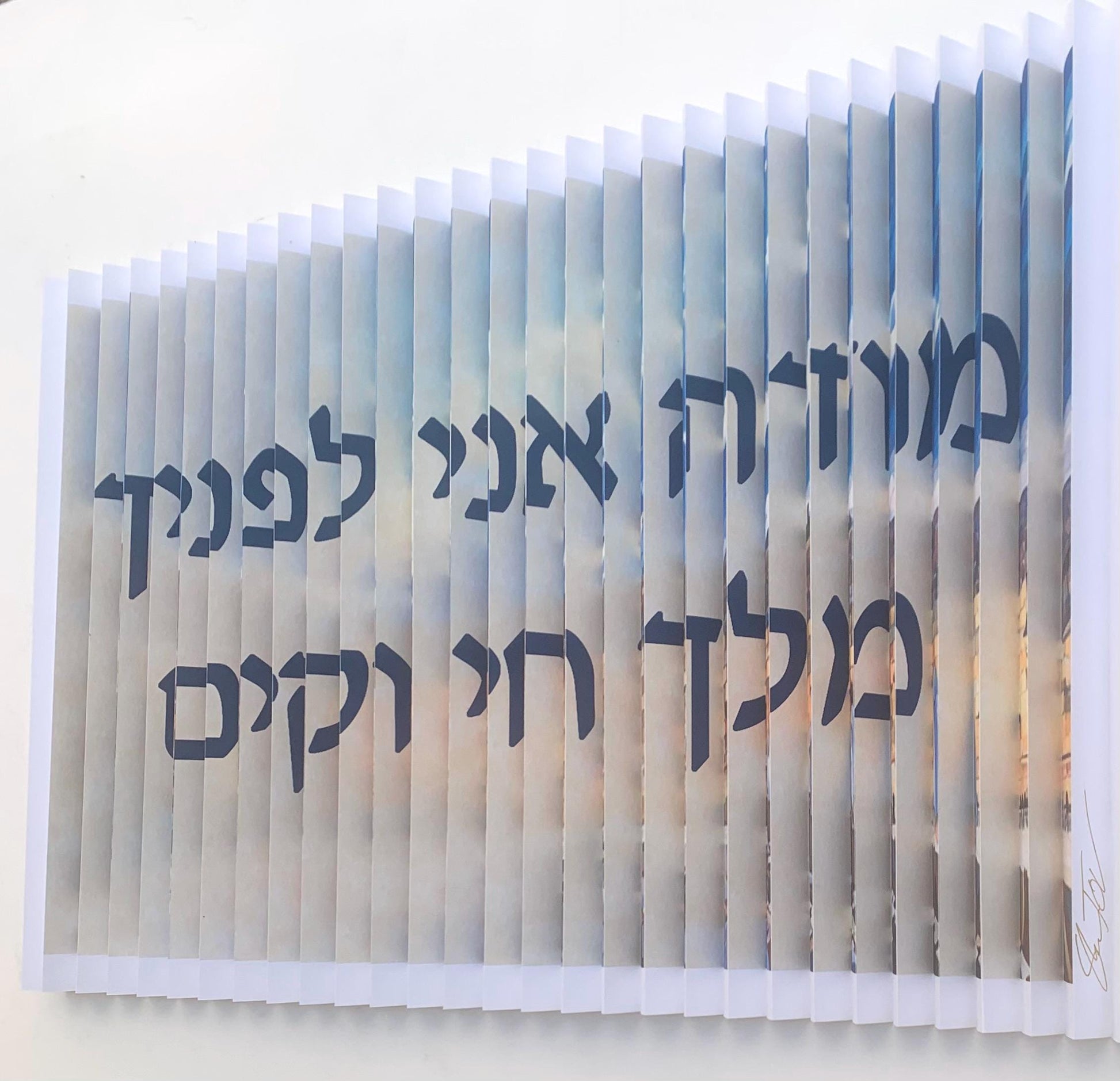 When viewed from a different angle, the image transforms into the words of the morning prayer, expressing our gratitude to God for returning our souls to us and allowing us to live another day.