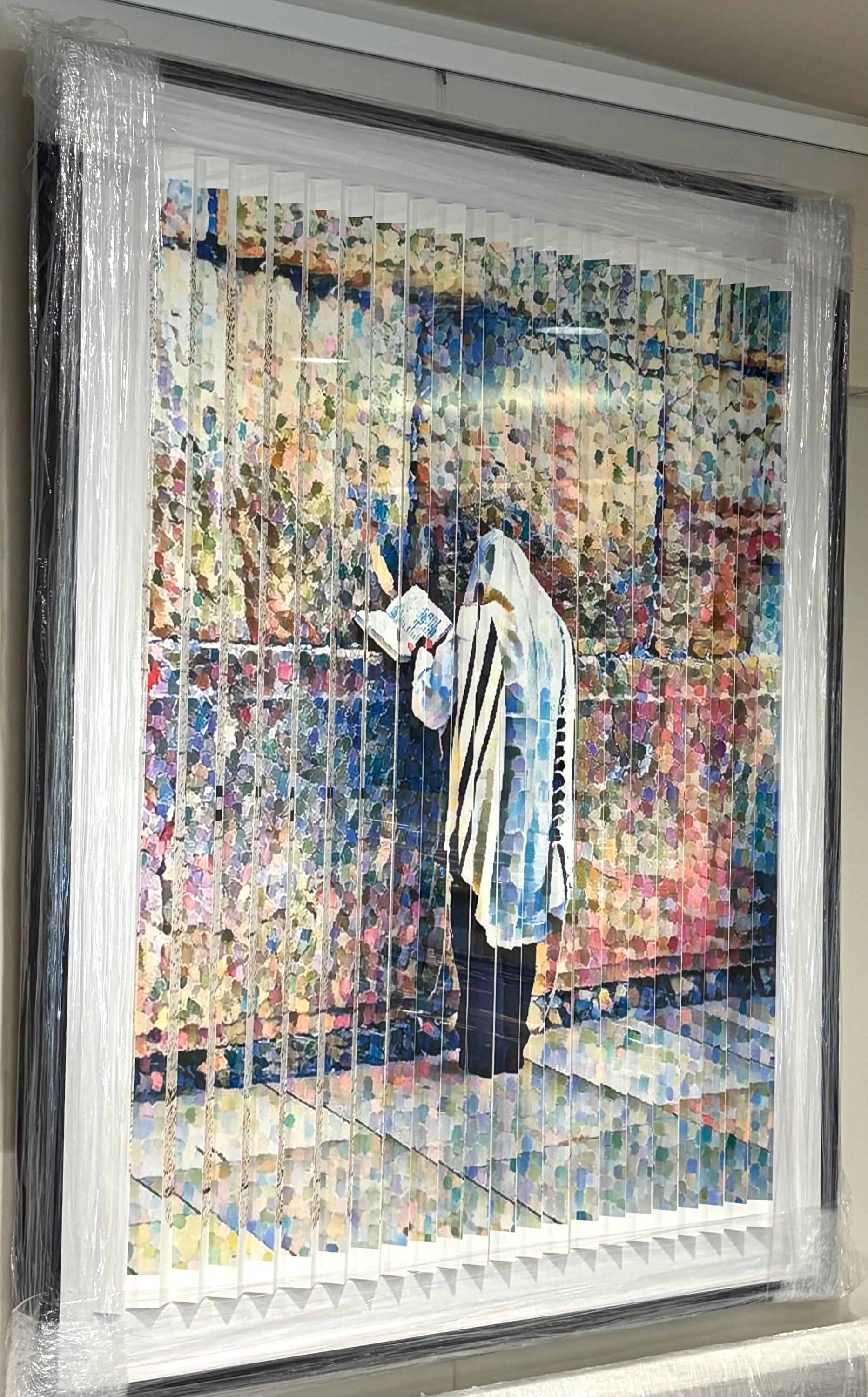 This wall sculpture is titled "Wailing at the Wall." It depicts a solitary man wrapped in his prayer shawl and tefillin, standing in reverent contemplation, facing the Wailing Wall. This sacred place is where countless individuals have come to pour out their hearts and souls to their Creator, seeking solace and connection.